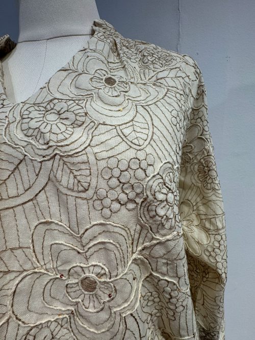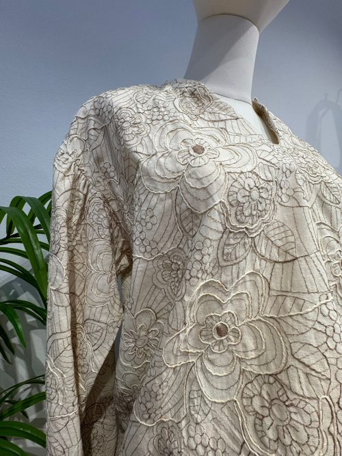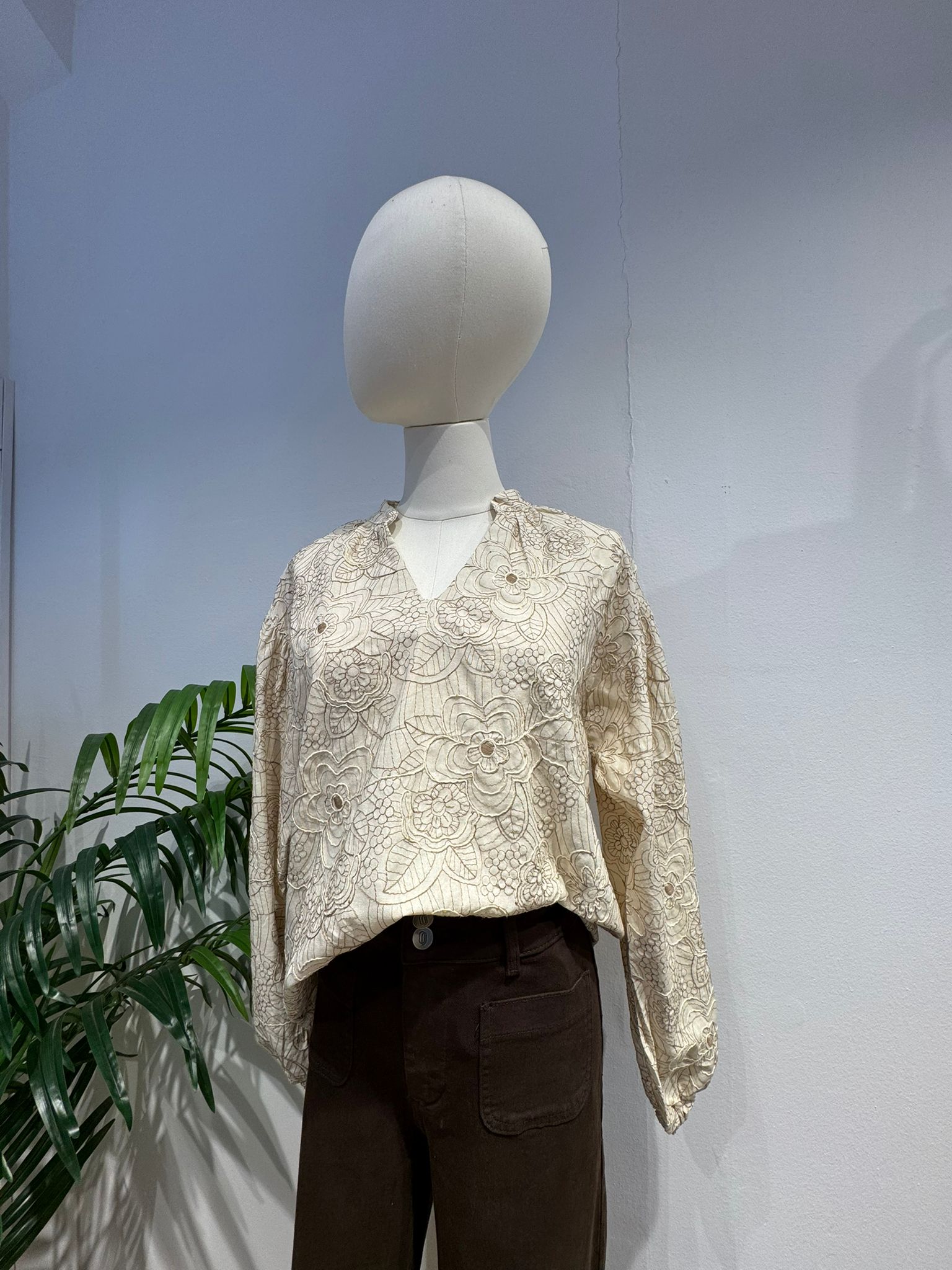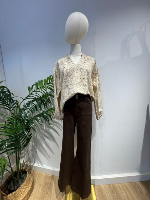 Añade un toque de elegancia natural a tu armario con esta blusa beige de diseño delicado. Confeccionada en un tejido bordado floral en tono marrón en relieve y unas lentejuelas pequeñas que aportan brillo diferente, ofrece un estilo romántico y sofisticado ideal para cualquier ocasión. Su escote en V y las mangas largas aportan comodidad y movimiento.