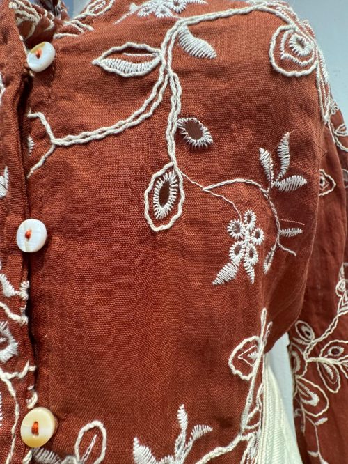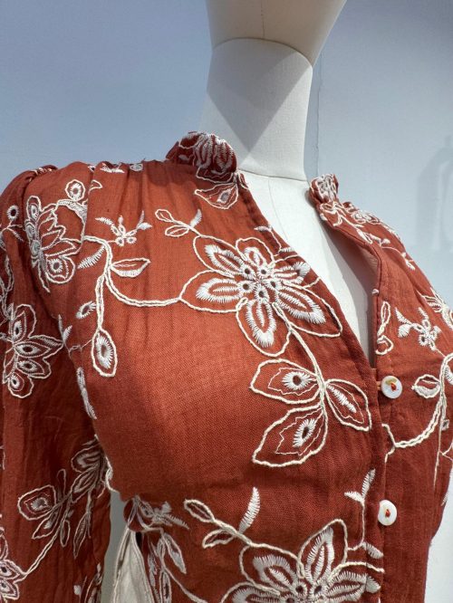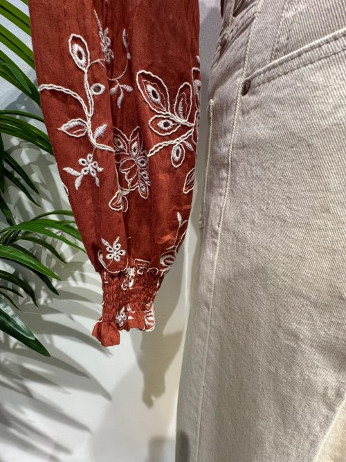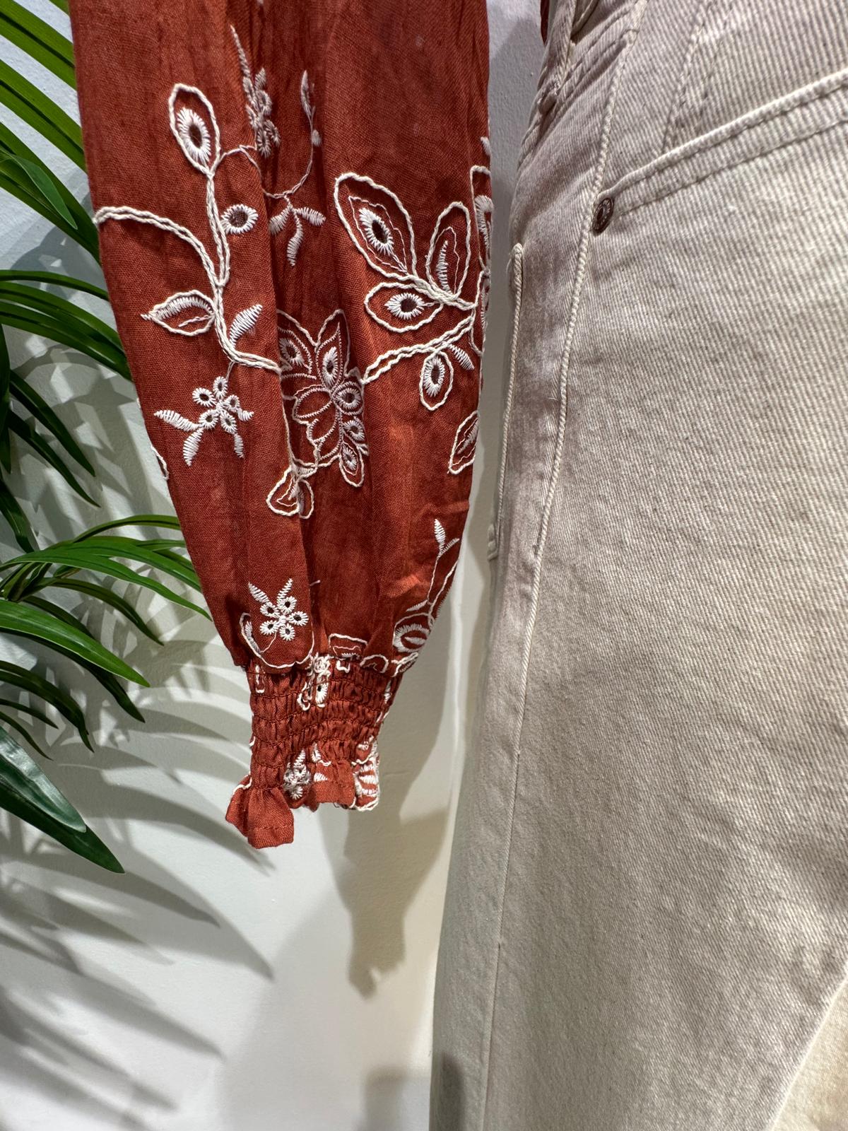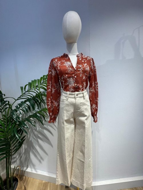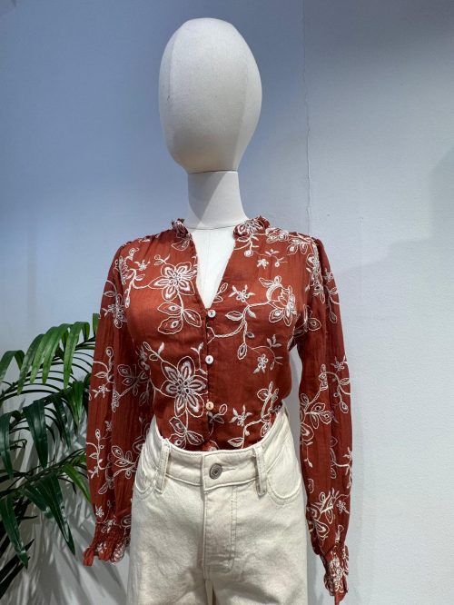 Dale un toque bohemio y elegante a tus looks con esta blusa caldera adornada con un bordado floral blanco que aporta contraste y personalidad. Confeccionada en un tejido ligero y transpirable, cuenta con cuello con pequeño volante, cierre frontal con botones y mangas largas con puño elástico, que aportan un aire romántico y femenino.