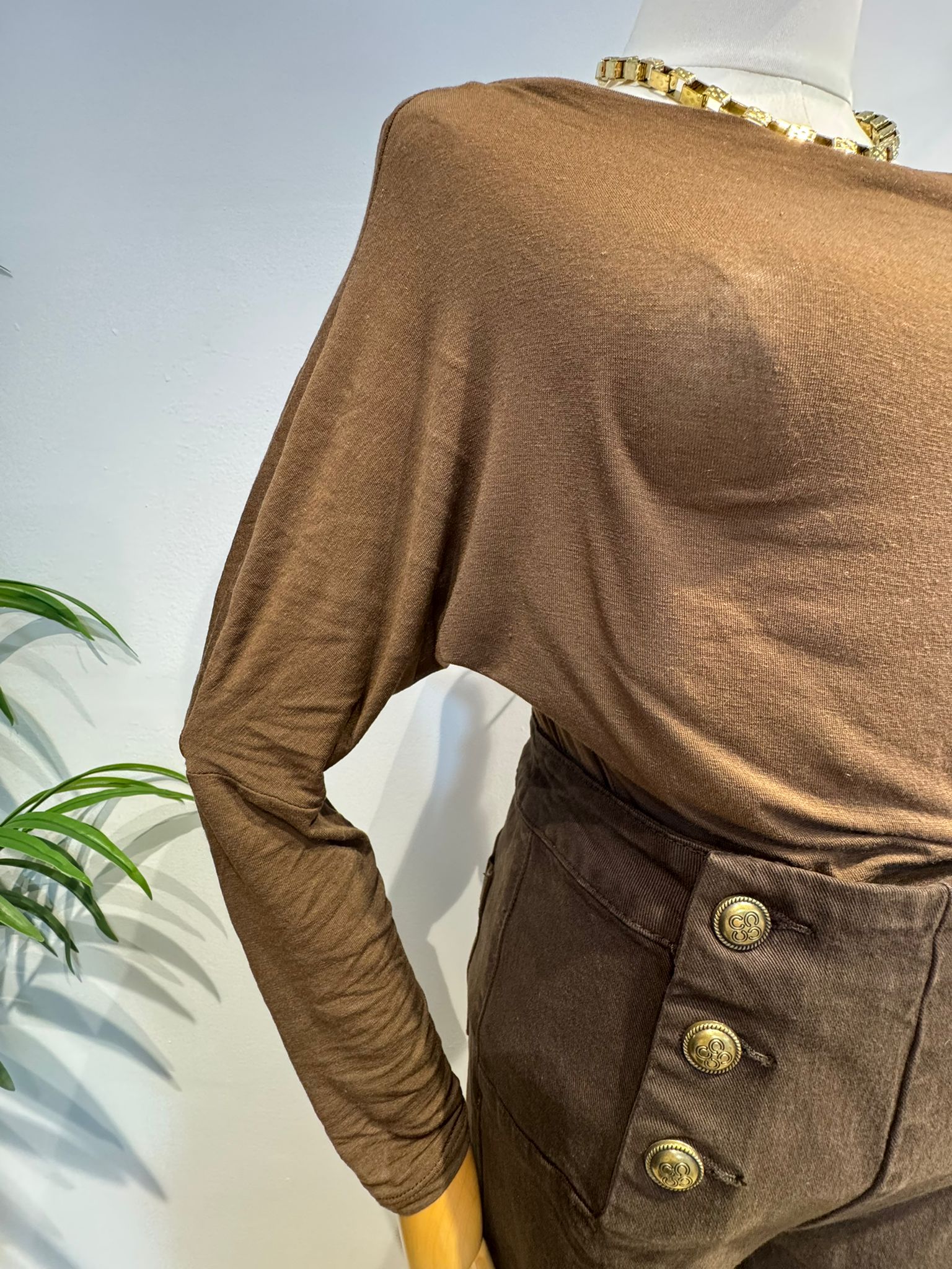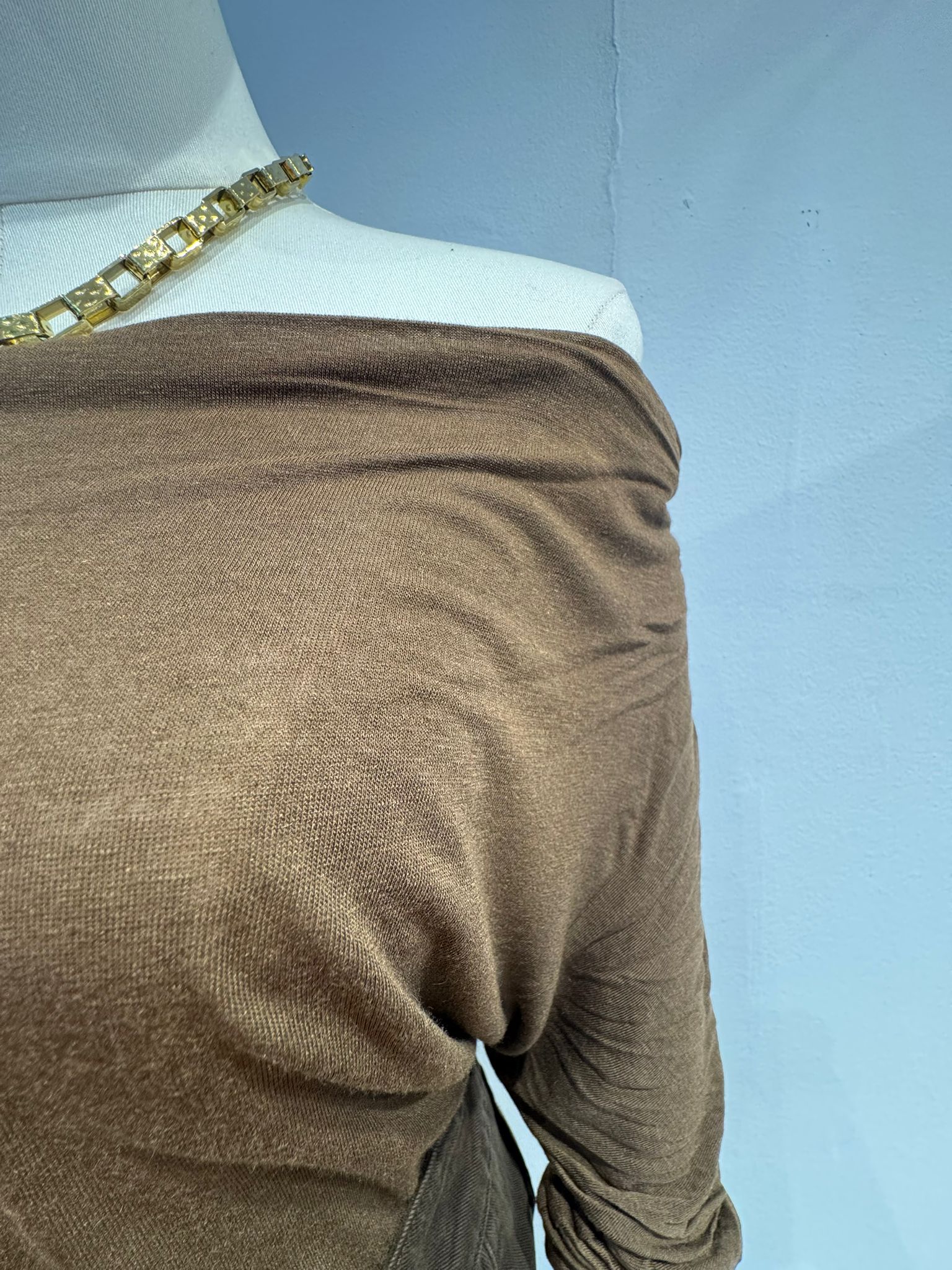Blusa fluida de manga larga confeccionada en tejido suave y elástico. Su diseño asimétrico con escote caído al hombro aporta un toque moderno y femenino. Ideal para combinar tanto con faldas como con pantalones y para looks de día y de noche.