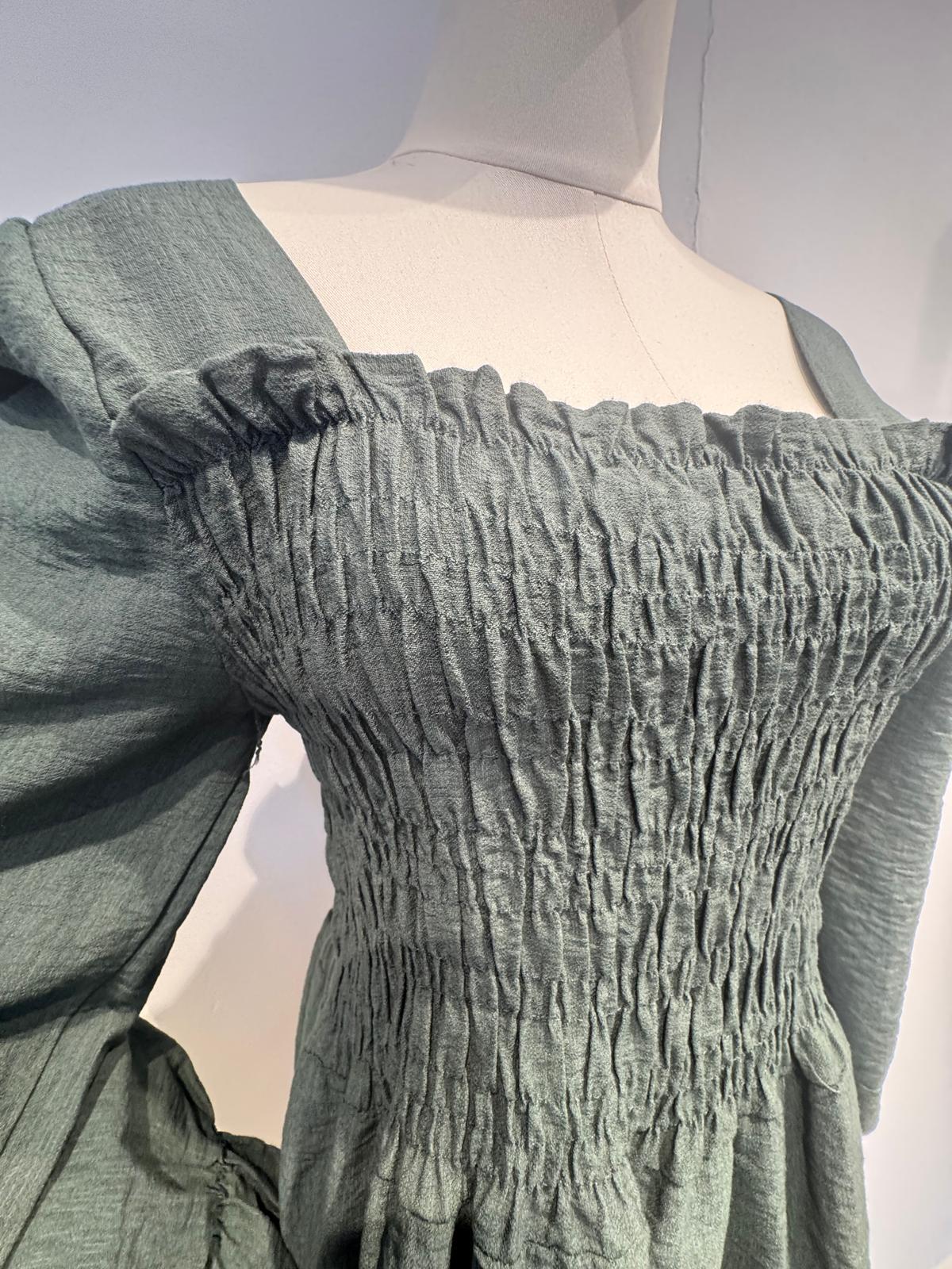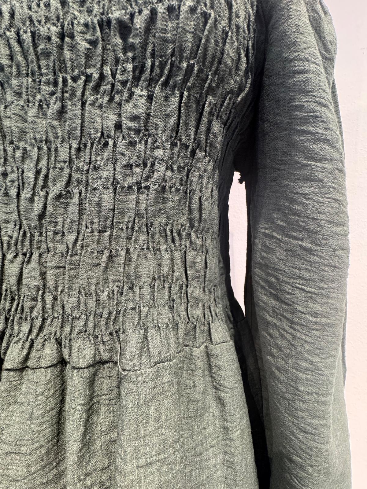 Esta blusa está confeccionada en un tejido ligero de textura arrugada, un diseño con cuerpo fruncido tipo nido abeja que se ajusta suavemente a la silueta, realzando la figura sin perder comodidad. El escote cuadrado y las mangas largas abullonadas con puños fruncidos aportan un toque romántico y femenino. Su bajo con ligera caída crea un efecto fluido ideal para combinar tanto con pantalones como con faldas.
