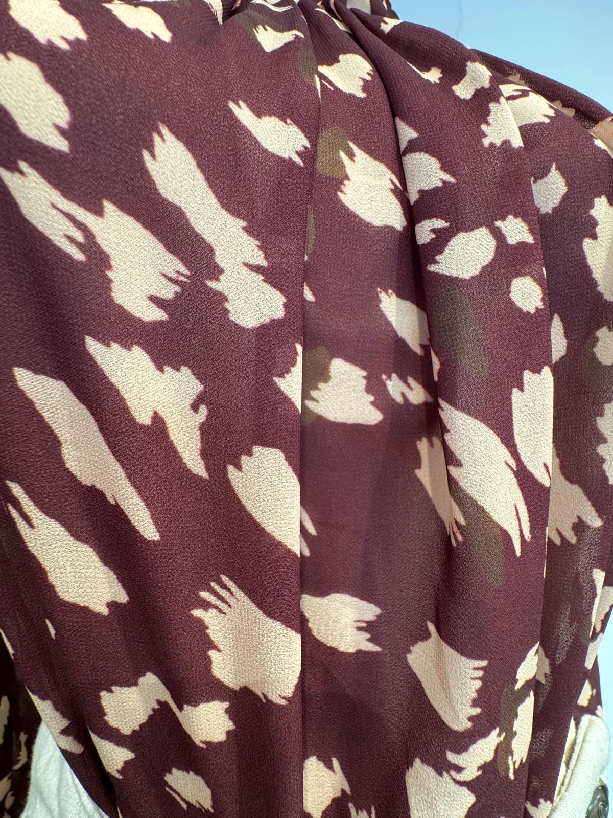 Confeccionada en un tejido ligero y ligeramente transparente, en un delicado tono teja o caldera. Bordado floral en color crudo, dispuesto en delicadas líneas verticales a lo largo de la prenda. Este detalle aporta textura, un toque artesanal y un gran valor estético. Cuello mao o cuello stand-up sin solapa, que crea una elegante abertura en V en el escote. Cierre con una hilera de botones pequeños en color perla, discretos y a juego.