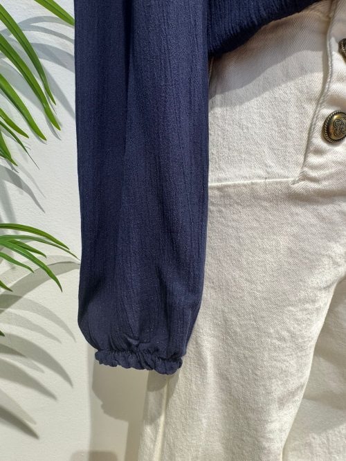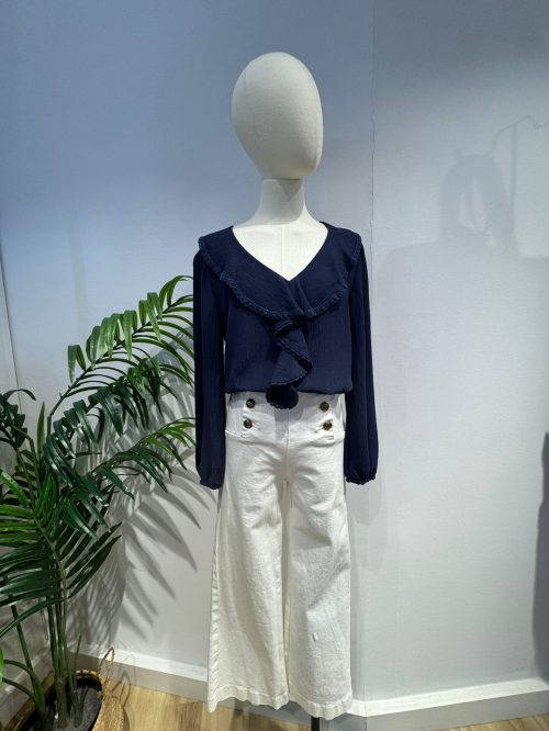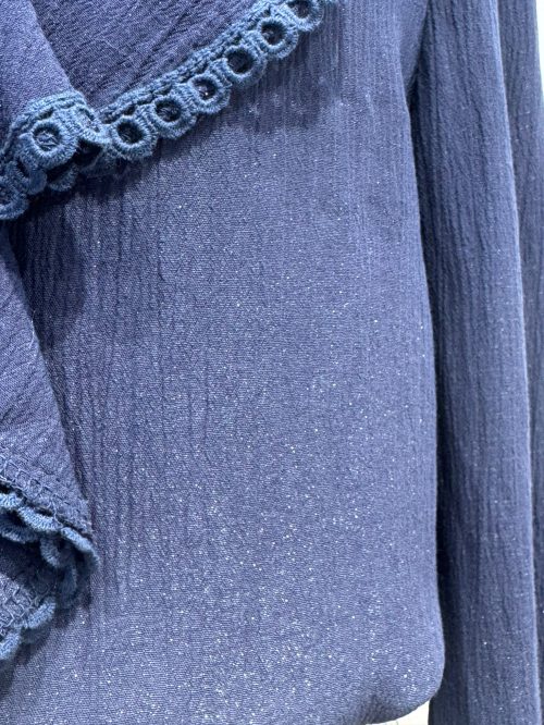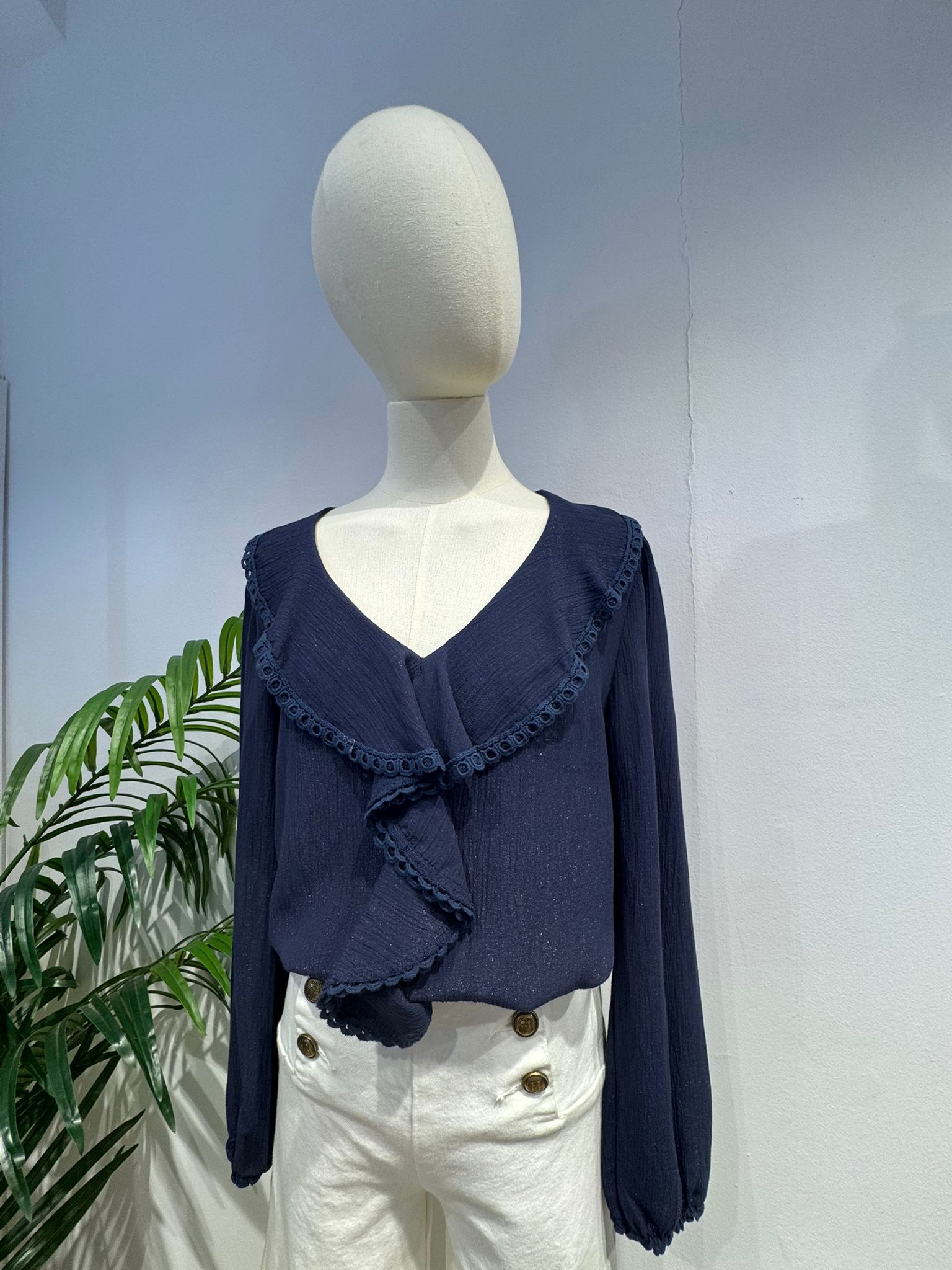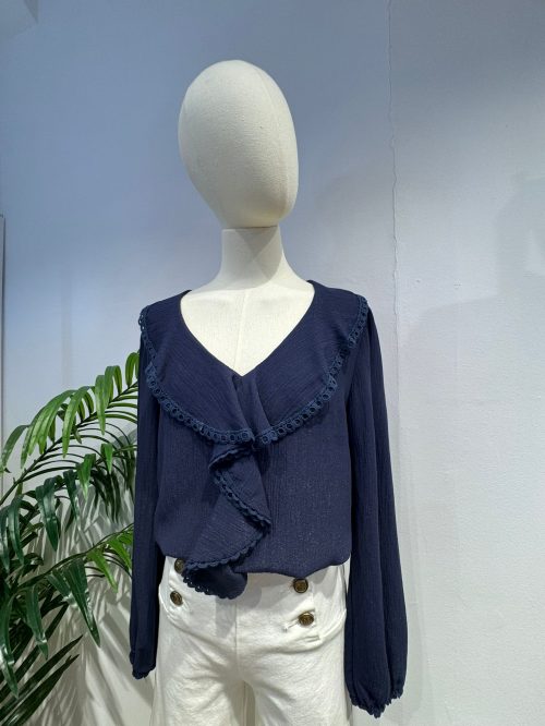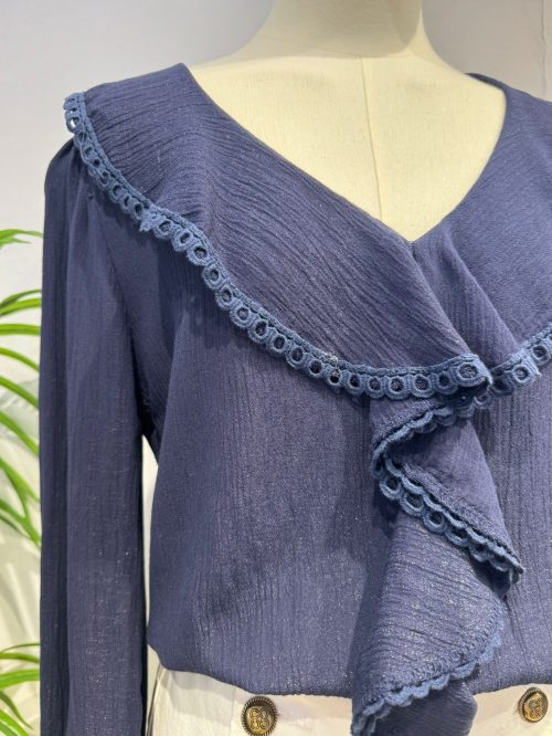 Eleva tu look con esta blusa fluida en tono azul marino. Confeccionada en tejido ligero y texturizado, destaca por su escote en V adornado con volante y acabado de encaje que aporta un toque romántico y femenino. Su diseño de manga larga y caída suave la hace perfecta tanto para el día como para la noche, combinando fácilmente con pantalones o faldas fluidas.
