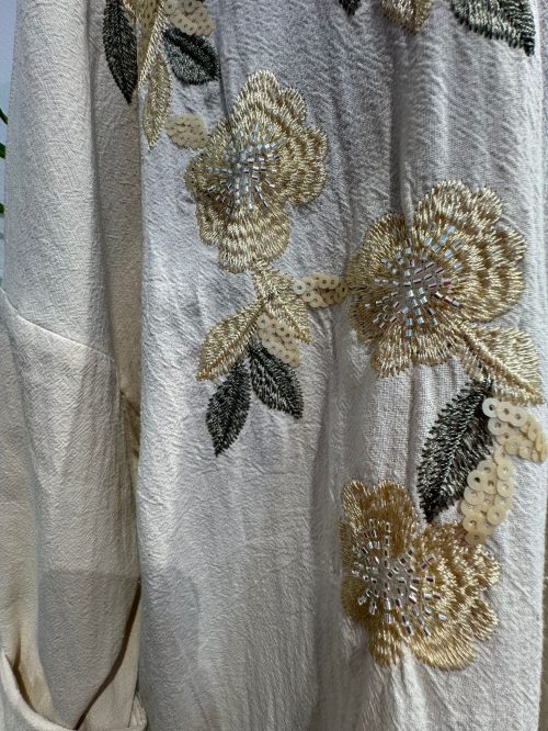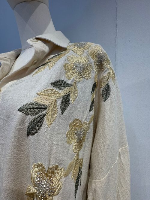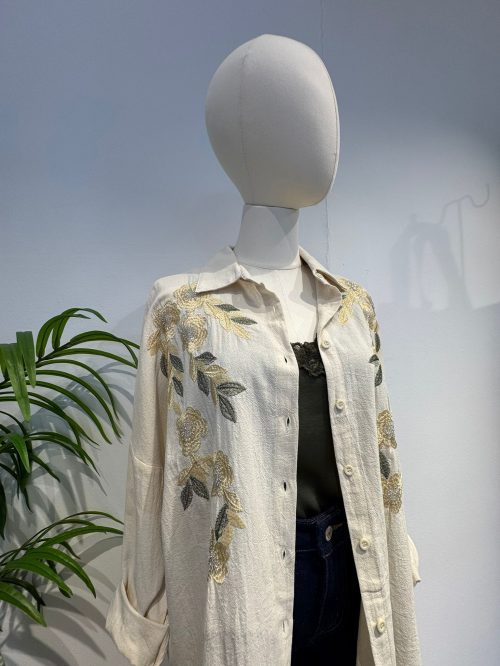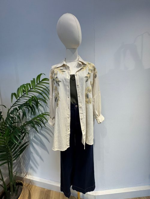 Una camisa de corte relajado, ideal para un estilo elegante y cómodo. Está confeccionada en un tejido ligero con una sutil textura arrugada en un tono verde oliva profundo. El diseño clásico del cuello y abotonadura frontal se realza con un delicado bordado floral en el pecho y hombros. Los bordados combinan tonos de verde claro, blanco roto y dorado suave, aportando un toque delicado y artesanal. Las mangas son amplias, proporcionando una caída fluida. Una prenda versátil para combinar con vaqueros, pantalones de lino o faldas midi, perfecta para transiciones de temporada.