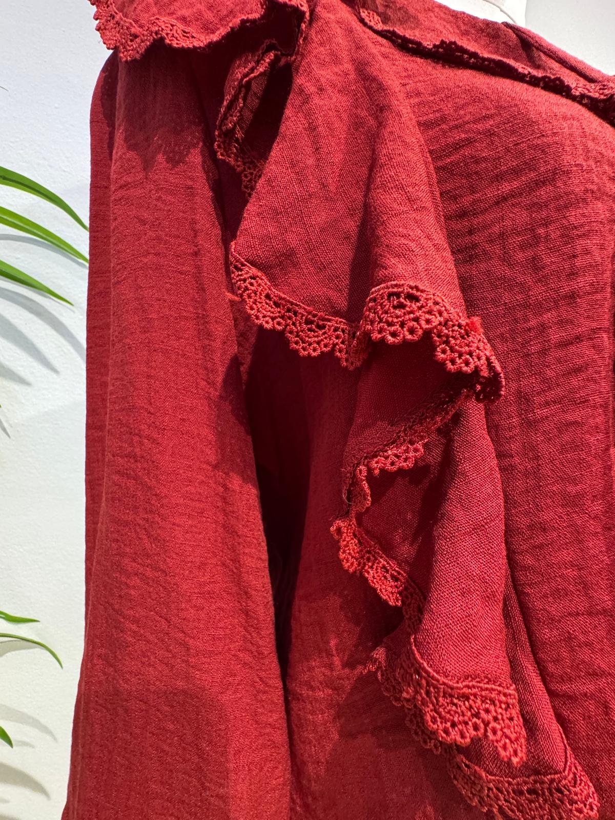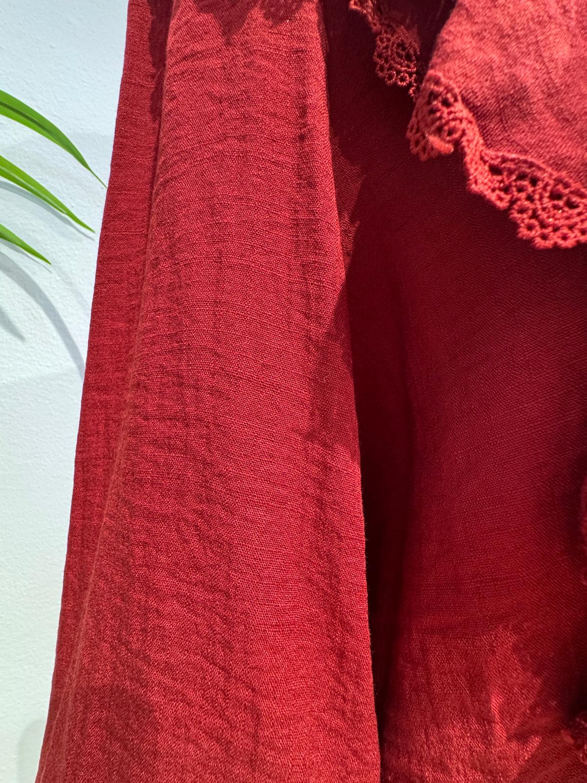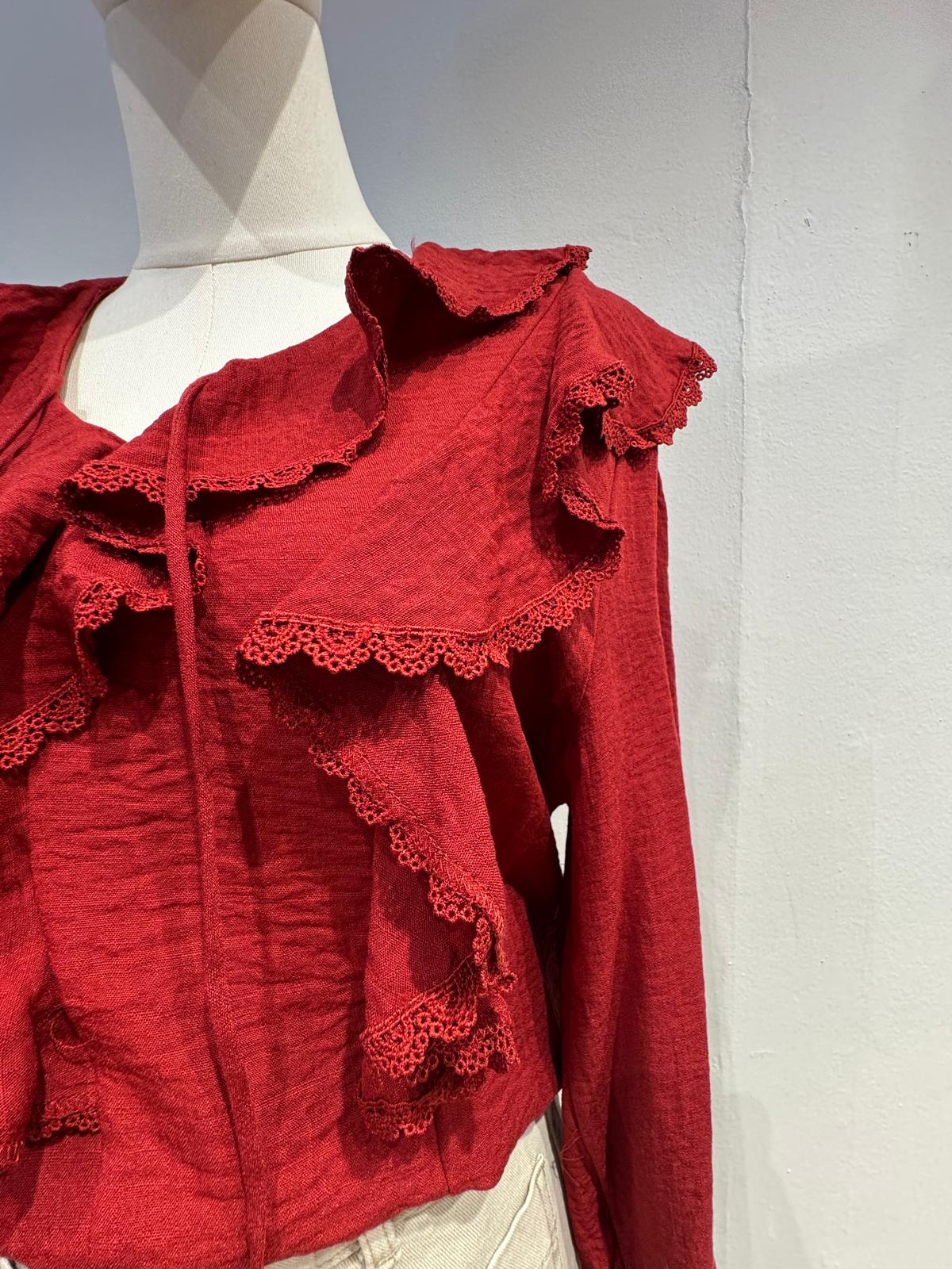 23,95€Dale un toque bohemio y elegante a tus looks con esta blusa caldera adornada con un bordado floral blanco que aporta contraste y personalidad. Confeccionada en un tejido ligero y transpirable, cuenta con cuello con pequeño volante, cierre frontal con botones y mangas largas con puño elástico, que aportan un aire romántico y femenino.