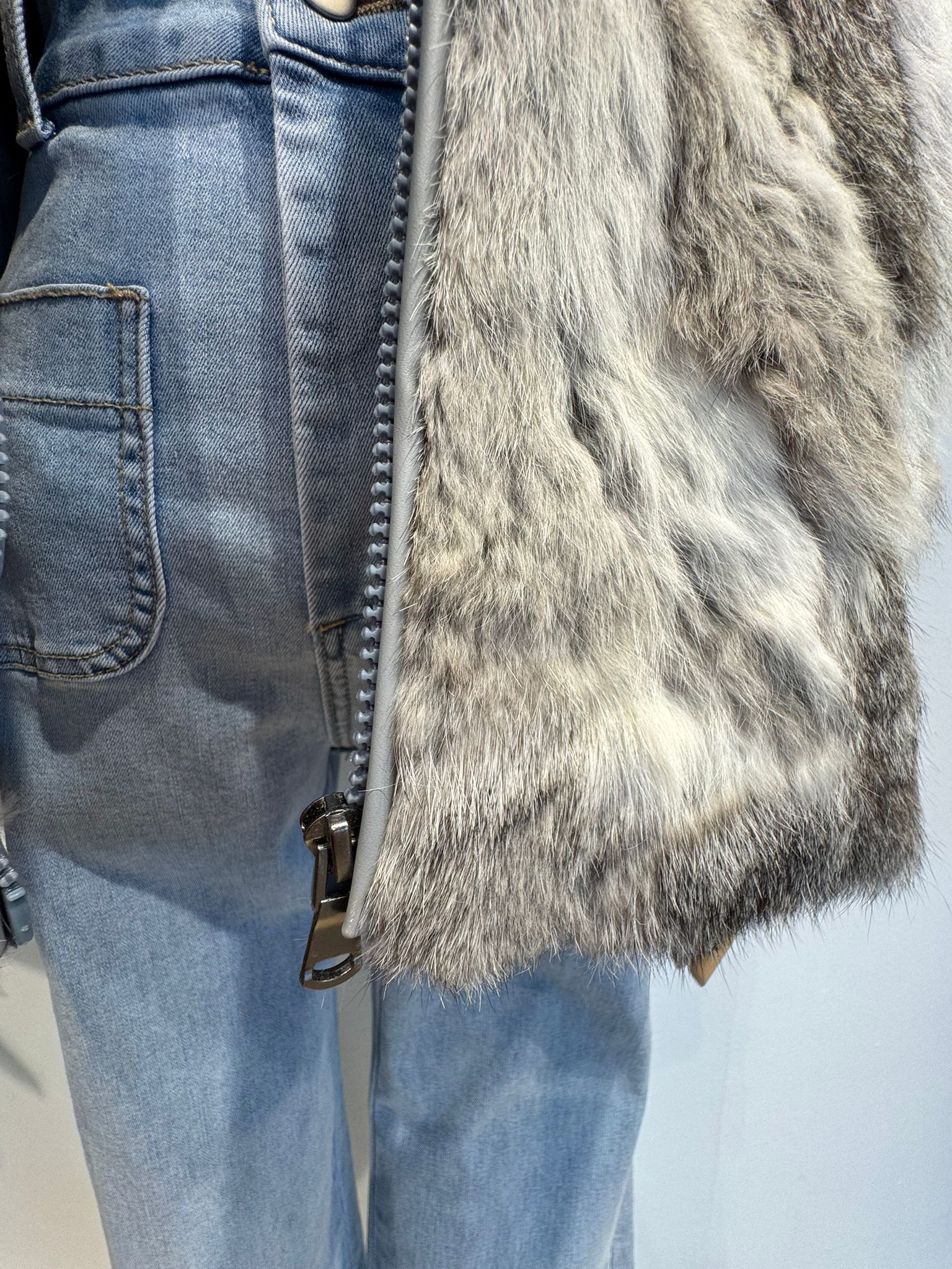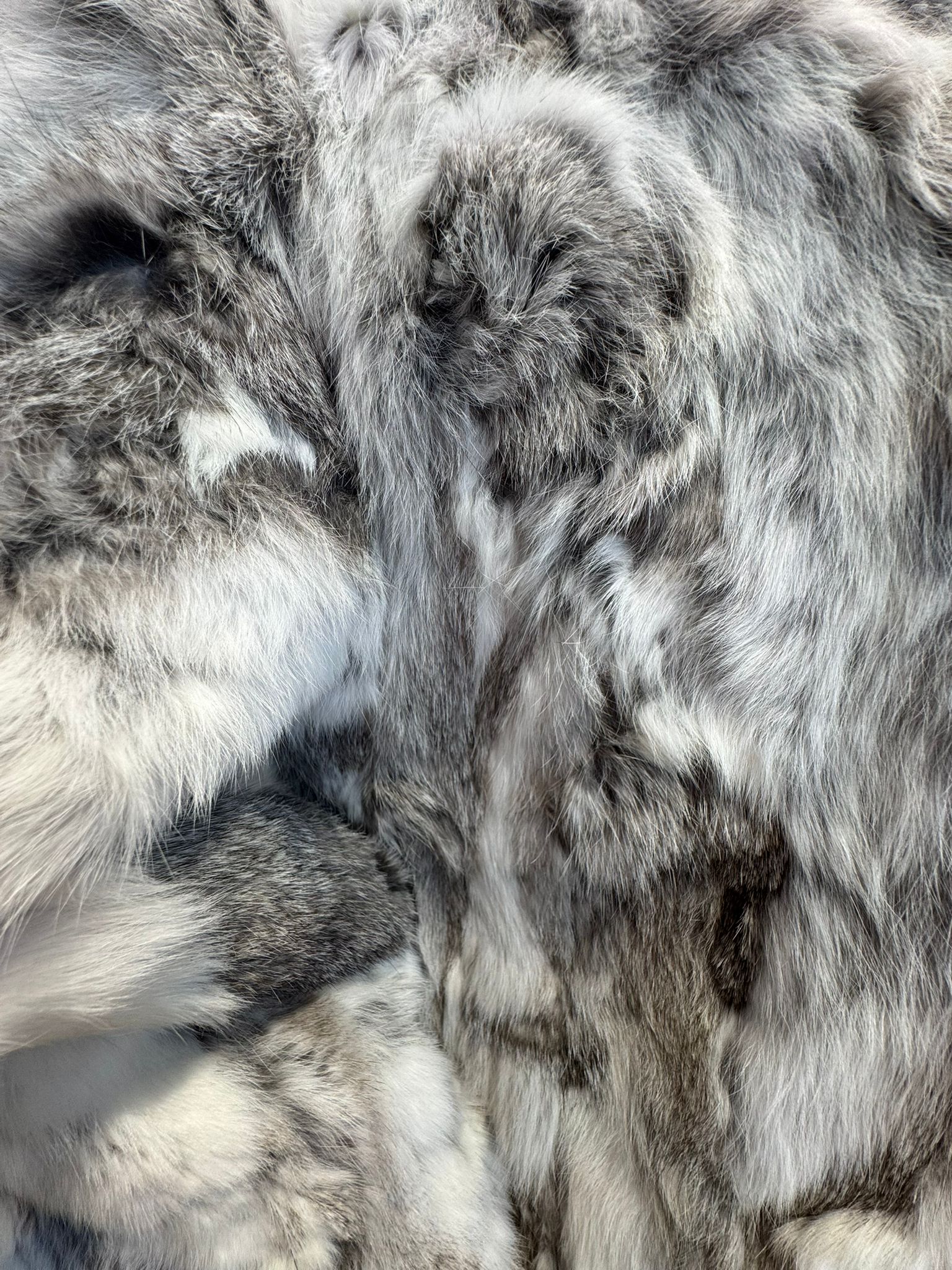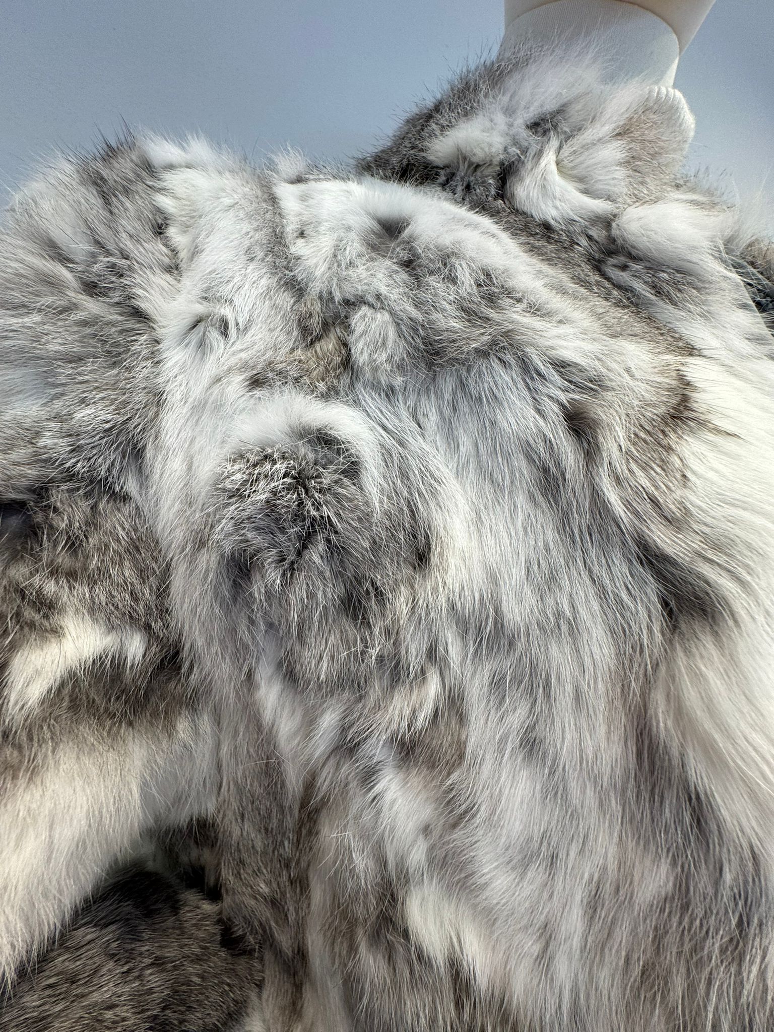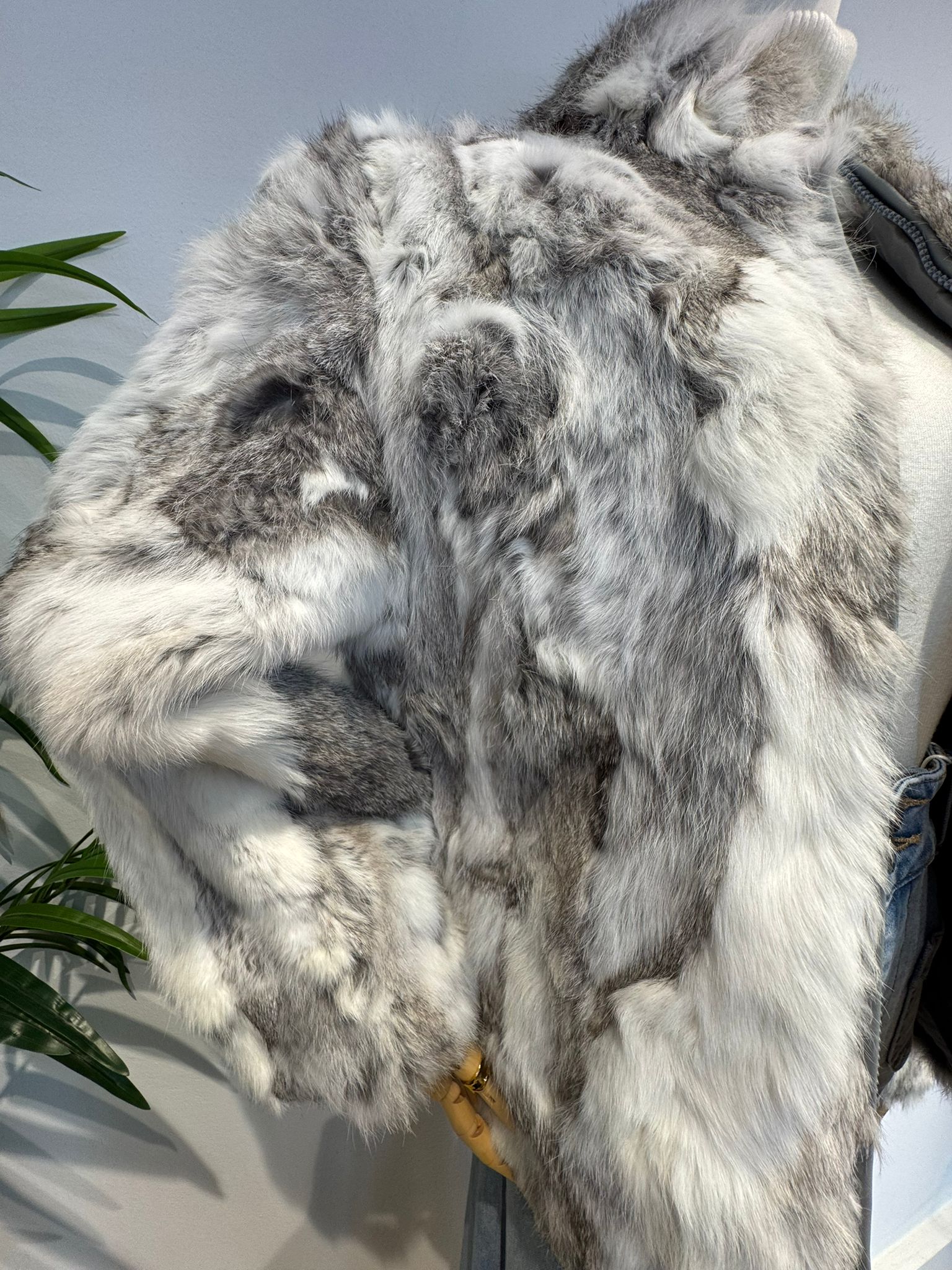 Atrévete con esta chaqueta de pelo bicolor, una pieza audaz y chic que te mantendrá abrigada con el máximo estilo. Su diseño combina tonos de gris y blanco en un patrón moteado y texturizado, que simula un pelo frondoso y suave, añadiendo un toque de lujo a tu vestuario.