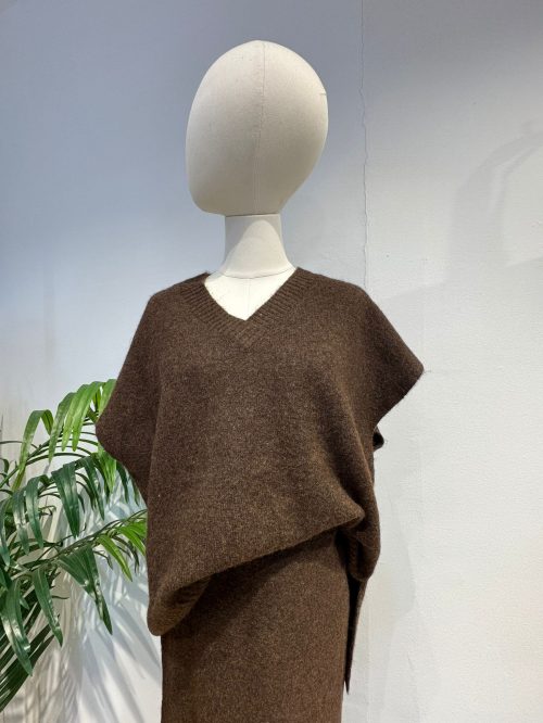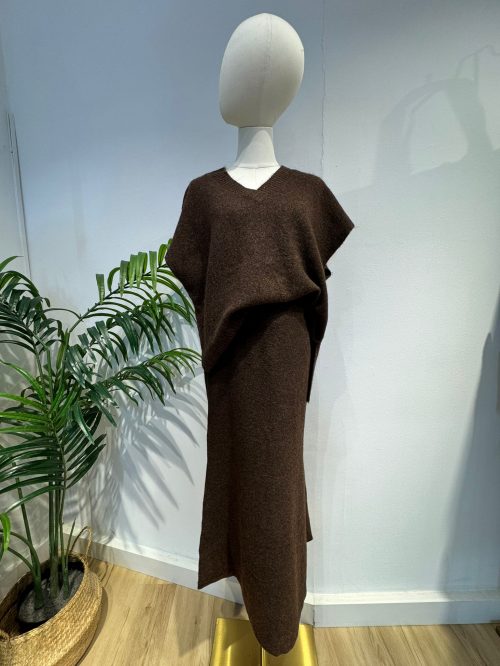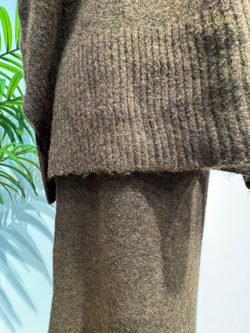 Este elegante conjunto de dos piezas es la definición de la comodidad chic para la temporada de frío. Confeccionado en un suave y cálido tejido de punto, favorecedor color marrón chocolate que es un básico atemporal y fácil de combinar.