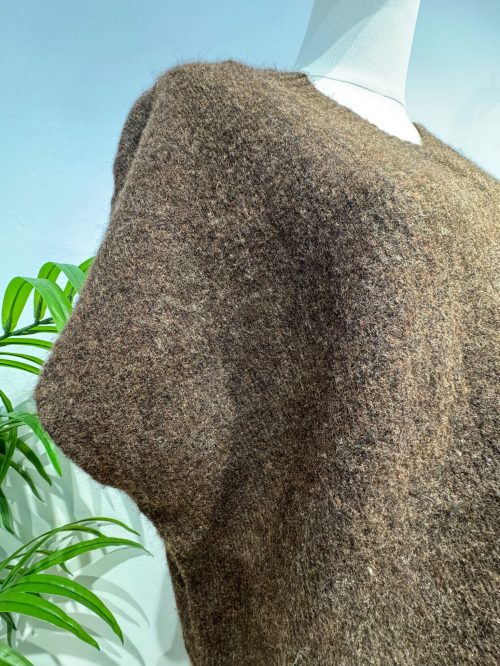 El jersey tiene un corte amplio y relajado con un escote en pico que aporta un toque moderno y desenfadado. Su caída y mangas cortas estructuradas lo hacen perfecto para llevar sobre otras capas finas o solo en días de menos frío.