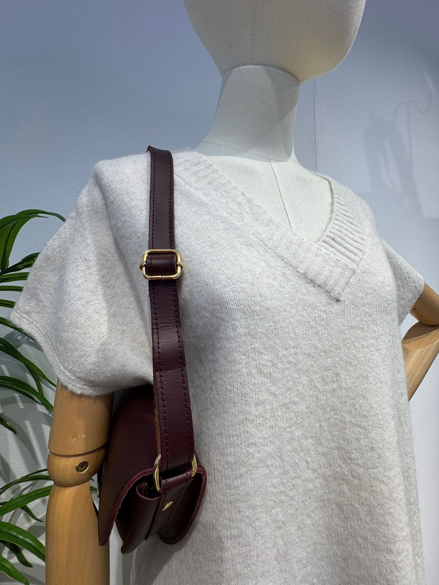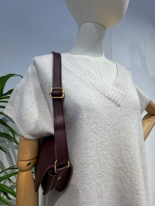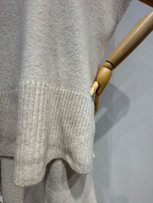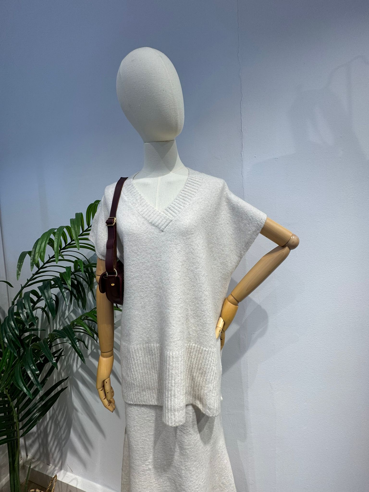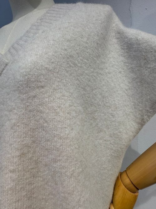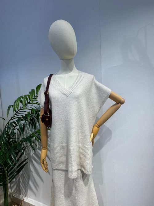 El jersey tiene un corte amplio y relajado con un escote en pico que aporta un toque moderno y desenfadado. Su caída y mangas cortas estructuradas lo hacen perfecto para llevar sobre otras capas finas o solo en días de menos frío.