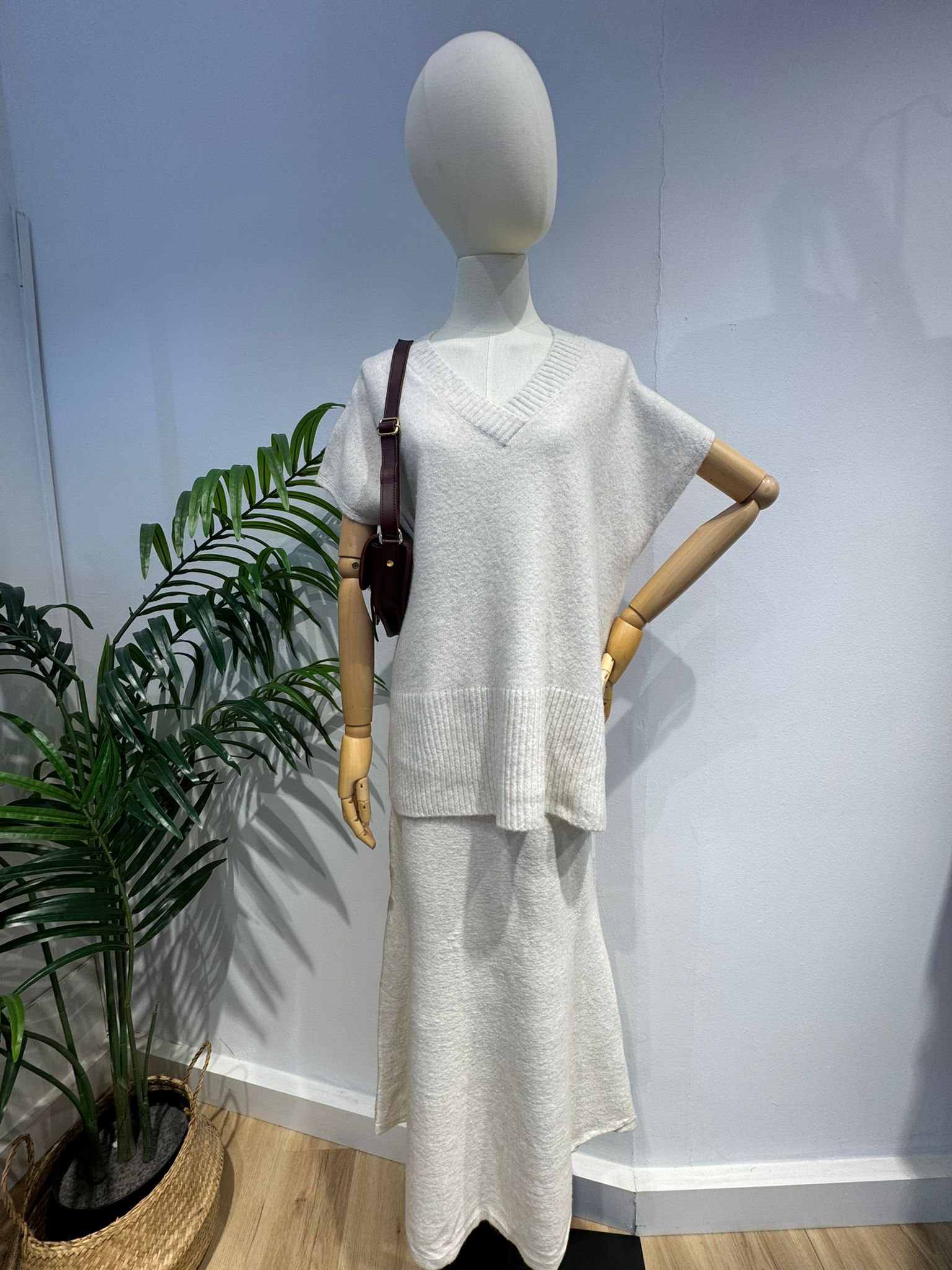 Este elegante conjunto de dos piezas es la definición de la comodidad chic para la temporada de frío. Confeccionado en un suave y cálido tejido de punto, favorecedor color crudo o marfil que es un básico atemporal y fácil de combinar.
