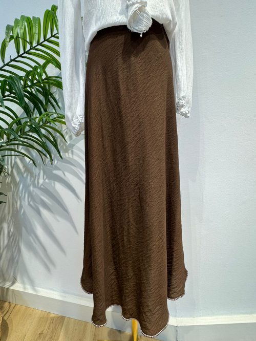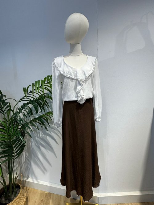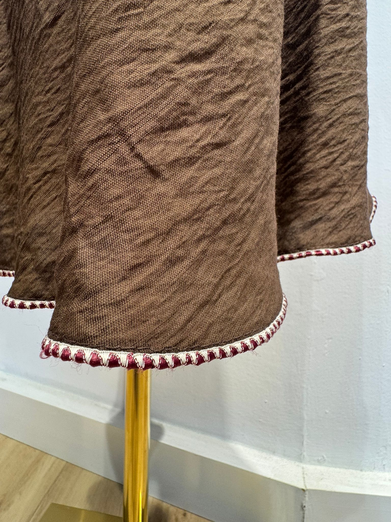 Esta elegante falda midi es una pieza esencial para un look con movimiento y sofisticación. Su rico color marrón chocolate la convierte en un básico versátil, perfecto para combinar en cualquier estación. Su corte se ajusta suavemente en la cintura y cae con una línea ligeramente acampanada, alarga y estiliza la figura. El borde del bajo está rematado con un delicado ribete ondulado en tonos crudo y burdeos que aporta un contraste dulce y femenino, dando un acabado único.