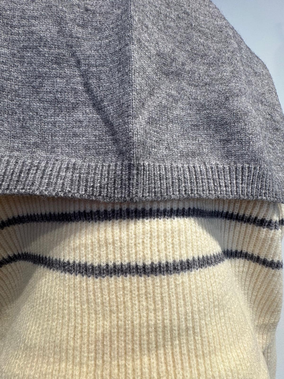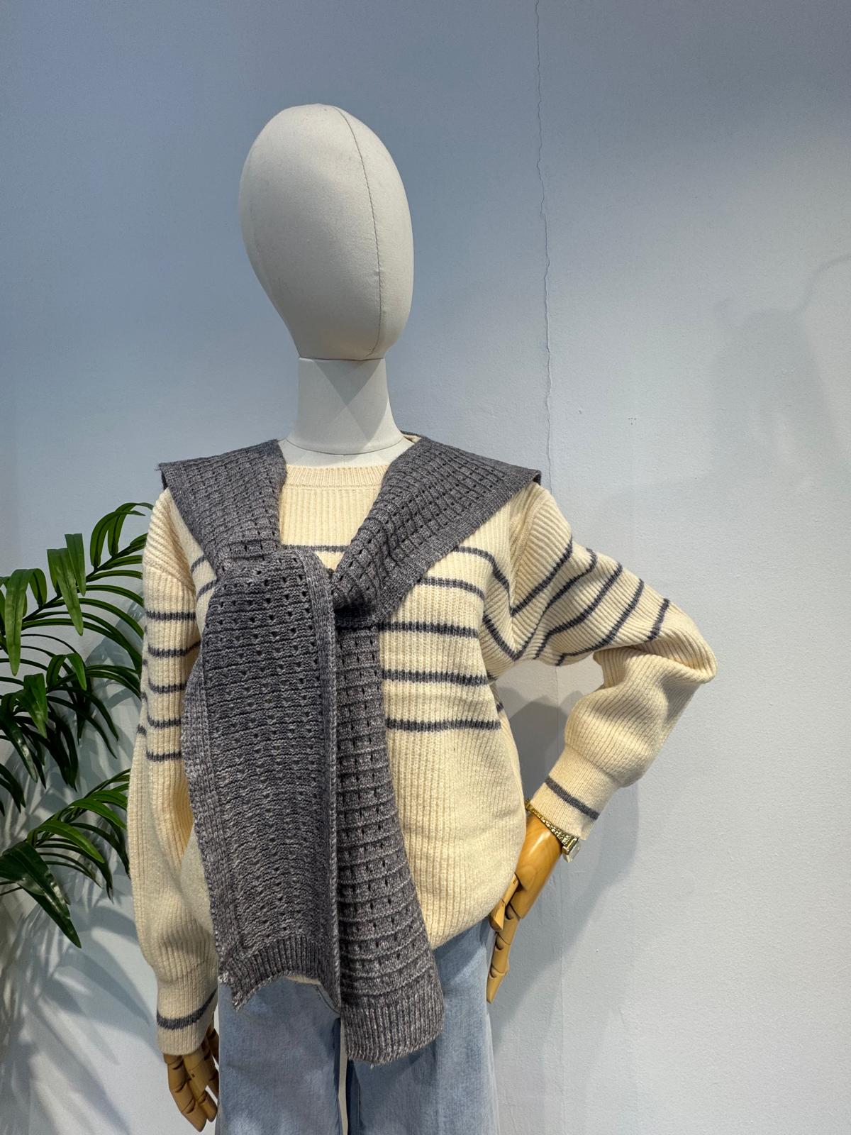 Base beige con rayas horizontales en un tono gris que le aportan un toque de color y sofisticación. El corte es de manga larga y cuello redondo.