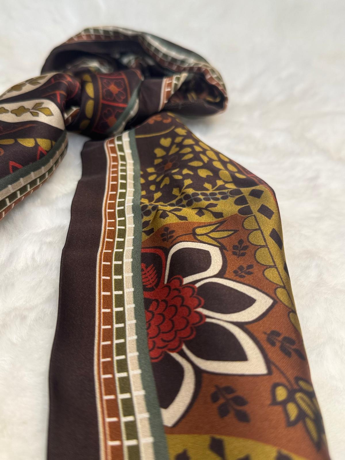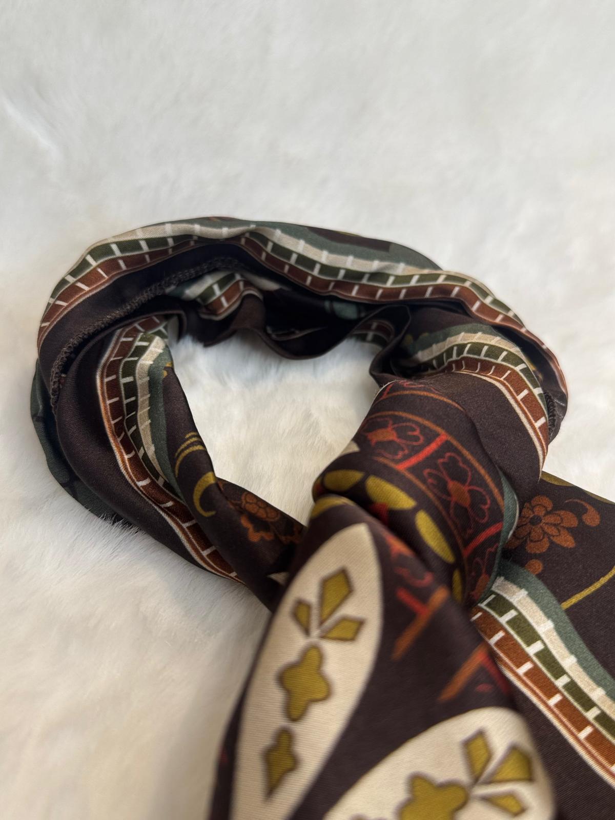 Pañuelo rectangular largo estampado en tono verde oliva, marrón y rojo.