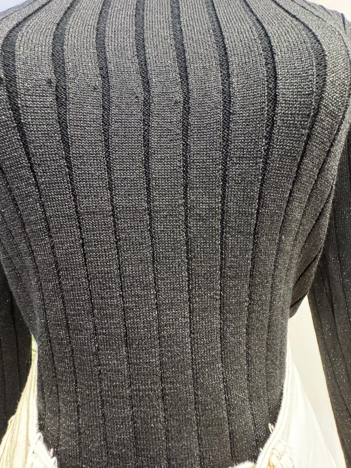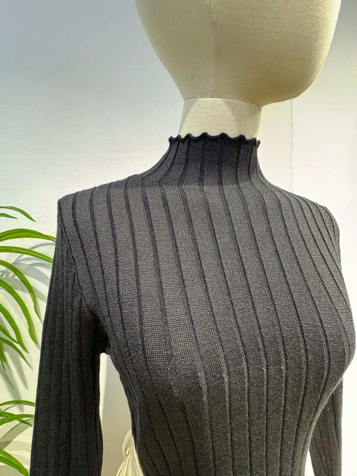 Base gris con rayas horizontales en un tono burdeos que le aportan un toque de color y sofisticación. El corte es de manga larga y cuello redondo.