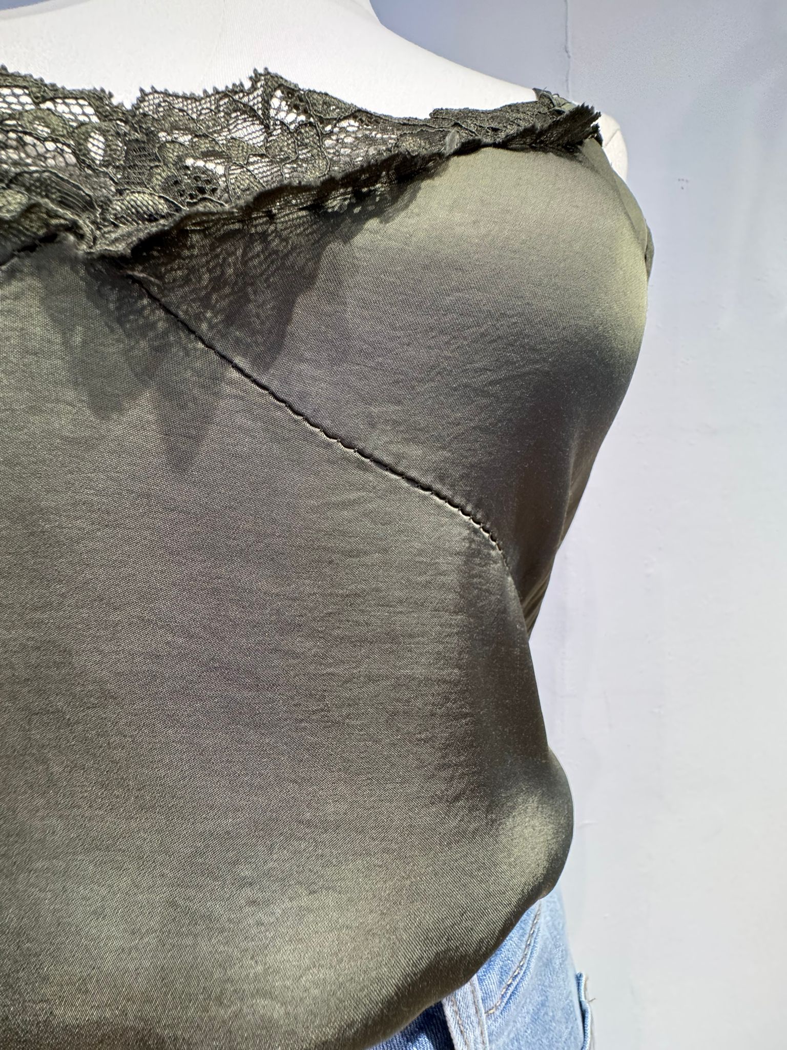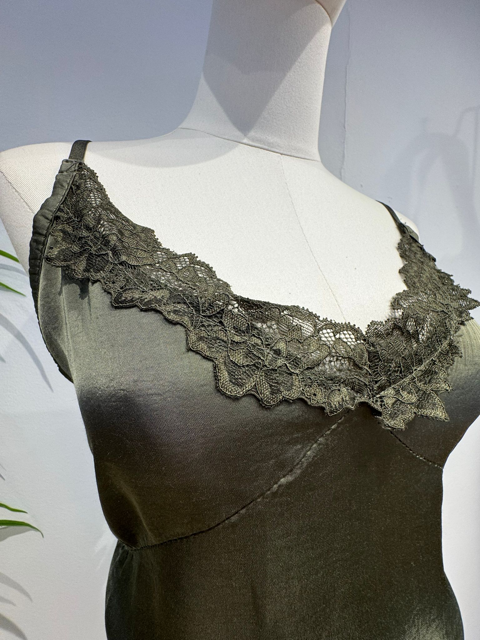 Lencero en tono verde que se caracteriza por su tejido de raso y su detalle de encaje en el escote en forma de V.