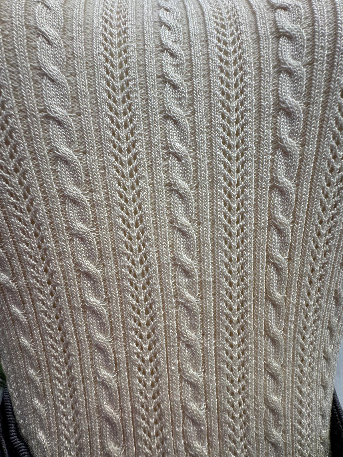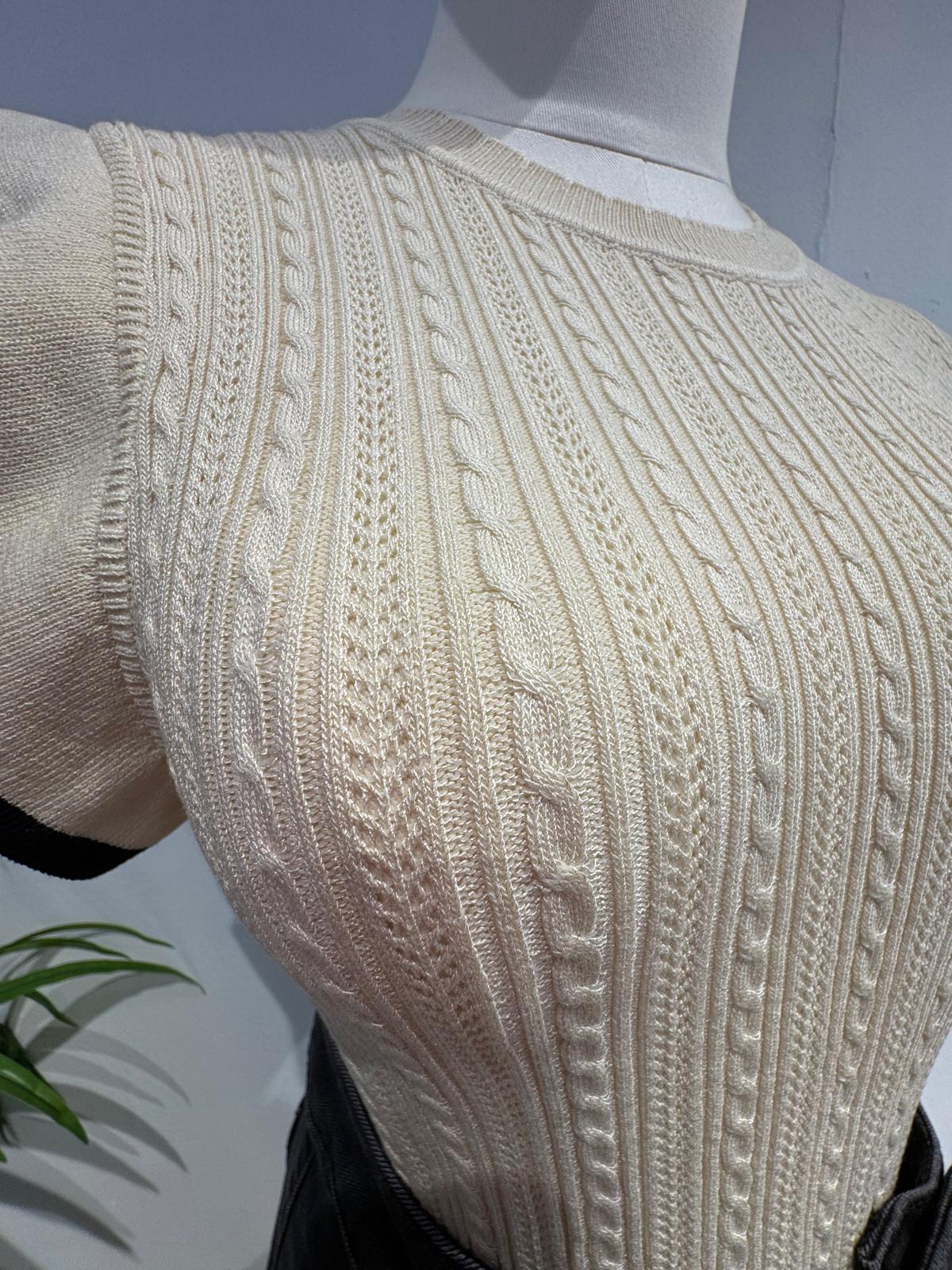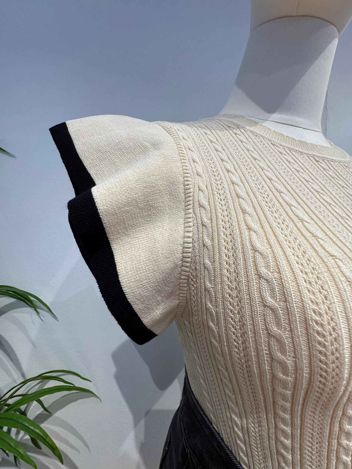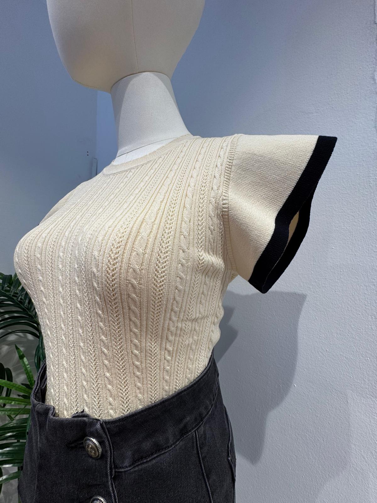 Confeccionada en un suave tejido de punto que ofrece un ajuste cómodo y favorecedor. Presenta un exquisito patrón de punto trenzado vertical que estiliza la figura y añade una rica textura visual. Un tono crema atemporal, que facilita la combinación con otras prendas. Las mangas cortas estilo mariposa o volante están rematadas con un llamativo ribete de contraste en color negro, creando un efecto visual audaz y moderno que enmarca los hombros. Corte ajustado y entallado al cuerpo que resalta la forma, con un cuello redondo clásico.
