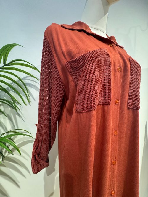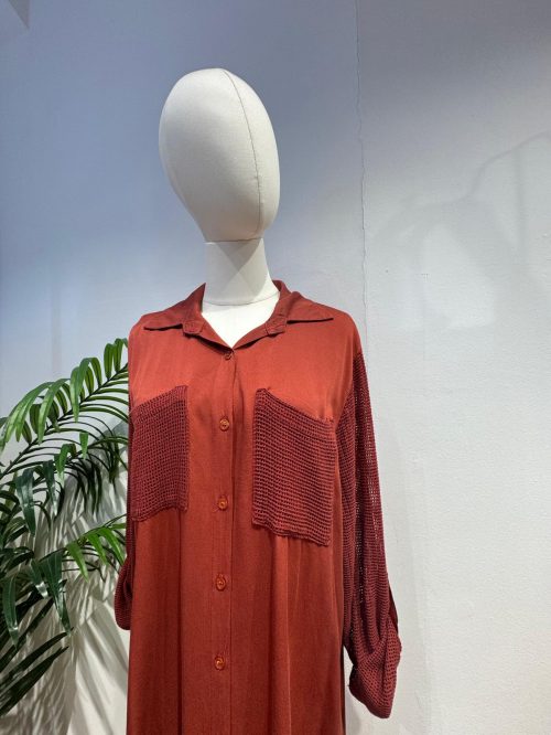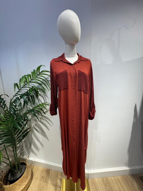44,95€Vestido marrón con corpiño fruncido que se ajusta al torso, sin mangas y escote redondo. Falda larga que cae desde la cintura con un corte que aporta movimiento.